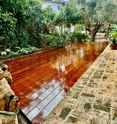 Las tarimas de maderas exóticas como la teca son la opción premium para quienes buscan durabilidad extrema y un acabado de lujo. Son naturalmente resistentes al agua, al sol y al desgaste, lo que las hace ideales para zonas de piscina o terrazas de alto nivel. Su color y veta única aportan un carácter exclusivo y elegante a cualquier ambiente.