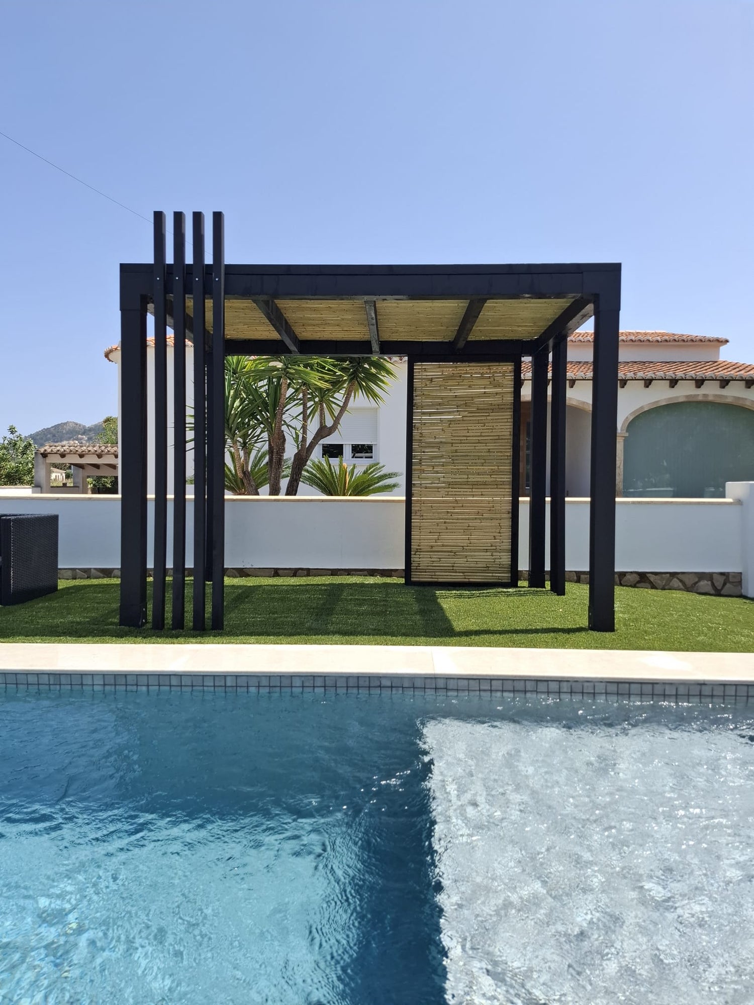 El cañizo es perfecto para quienes buscan una delimitación con estilo mediterráneo. Está formado por cañas finas unidas entre sí y se puede utilizar tanto en cerramientos laterales como en cubiertas para dar sombra. Es económico, fácil de mantener y ofrece una protección visual efectiva.